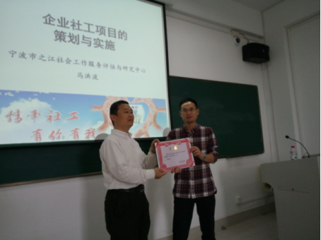 社会工作系邀请了宁波市之江社会工作服务评估与研究中心主任马洪波来到《企业社会工作》课堂,围绕企业社工项目的策划与实施为社工系学生开展了一次别开生面的讲座。在讲课前,社工系主任陈建胜副教授为马洪波颁发了p站视频