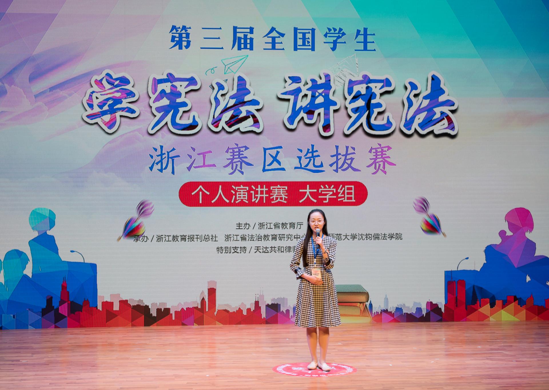 此次比赛经过学校选拔和省初赛筛选,最终确定由吴佳慧同学代表浙江财经大学参加比赛。比赛中,吴佳慧以“从法治浙江看法治中国”为主题,揭示了《宪法》在全面推进依法治国中的地位和作用,探索了《宪法》在浙江发展中的实施路径。饱满的感情、流利的表达、较强的现场感染力,让吴佳慧同学在所有选手中脱颖而出,获得第二名的好成绩。比赛前期,唐勇老师担任指导,负责甄别选题、修改演讲稿、指导演讲仪态与礼仪等。