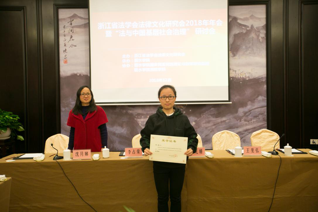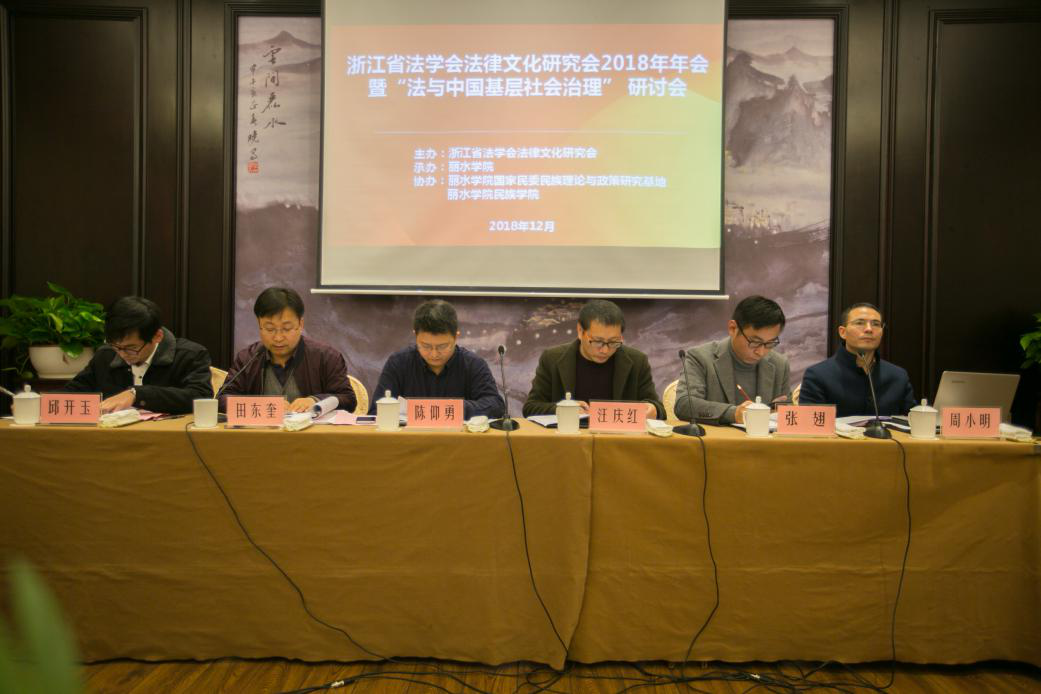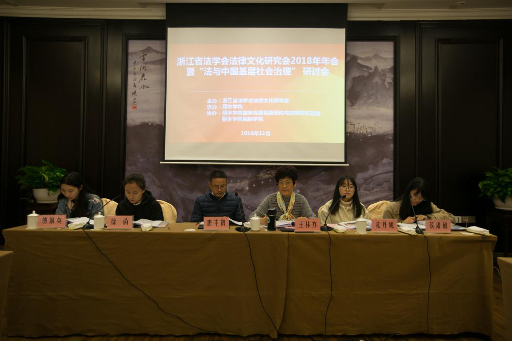 2018年12月1日上午9时,由浙江省法学会法律文化研究会主办、丽水学院承办、丽水学院国家民委民族理论与政策研究基地和丽水学院民族学院协办的浙江省法学会法律文化研究会2018年年会暨“法与中国基层社会治理”研讨会在丽水市莲城宾馆召开。来自丽水学院、浙江财经大学、宁波大学、杭州师范大学、浙江工业大学、湖州师范学院、浙江子城律师事务所等政府机关、高校、中介机构的法律工作者、专家学者、在校学生共计五十余人参加了此次年会。