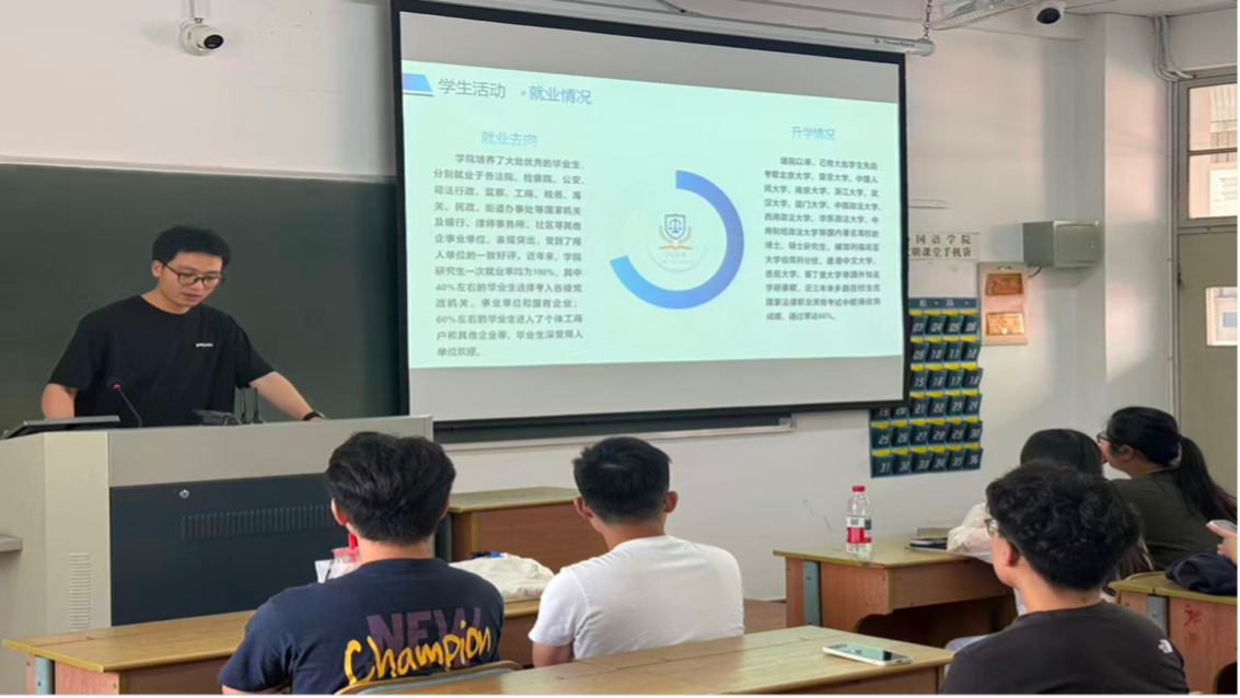 的学习体验。在经验分享环节,洪宇帆和梁宇杭同学分别从择校策略和备考方法等角度提供了具体建议,包括如何根据个人发展规划选择适合的研究生方向,以及如何在备考过程中保持良好心态和学习效率。互动环节中,学生们积极提问,问题涉及备考技巧、专业选择、复试准备等多个方面,宣讲团成员逐一给予耐心解答,现场交流充分。